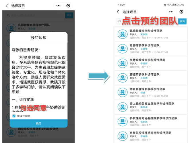 “微信公众号”预约挂号,点击“多学科门诊”,选择要会诊的团队,预约成功后1-2个工作日将由团队秘书与患者联系确认就诊时间,请务必填写有效联系方式并保持手机畅通。