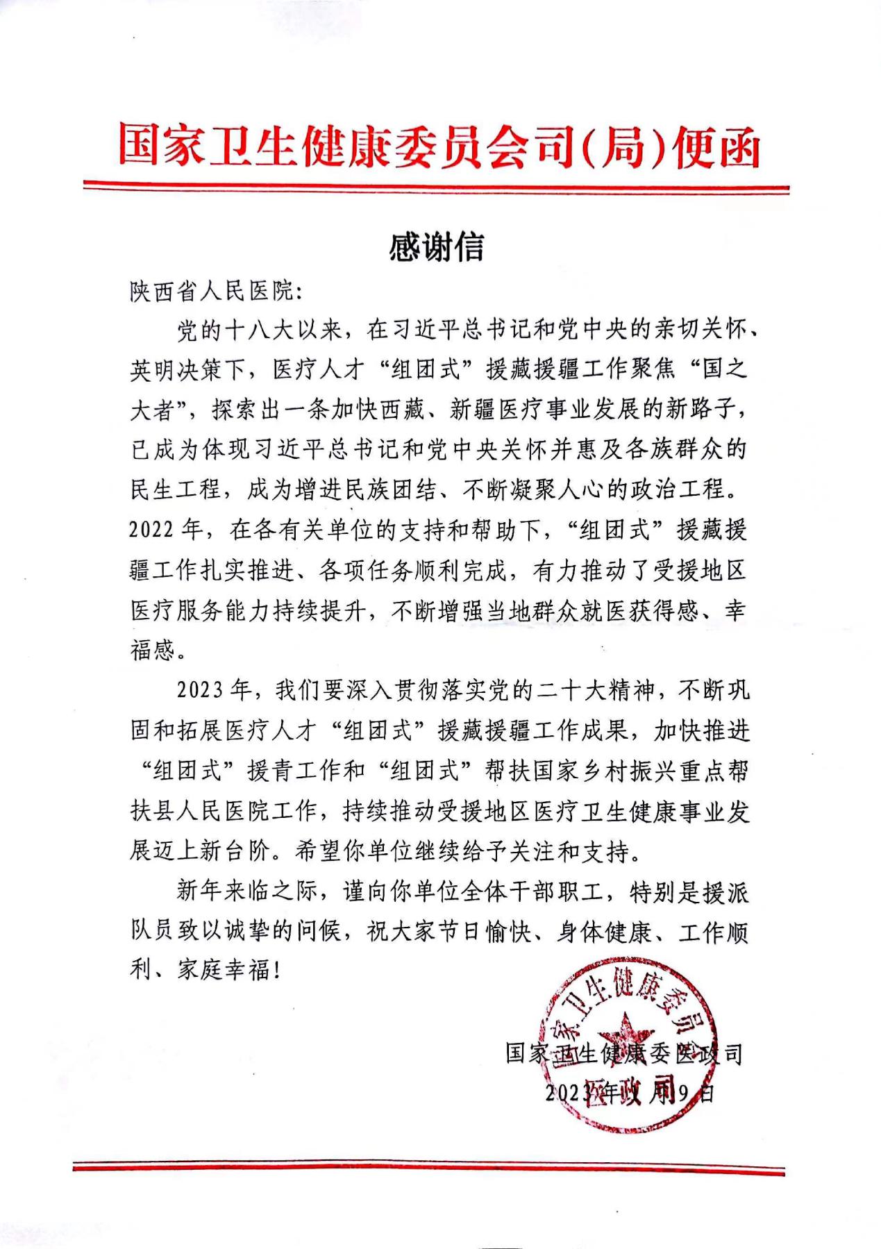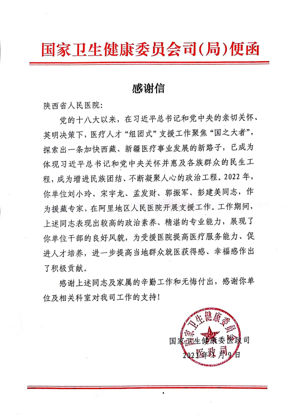 编者按:近日,欧美视频 收到国家卫生健康委员会医政司发来的感谢信,感谢欧美视频 自2015年以来开展的“组团式”援藏工作,至今欧美视频 已累计派出8批16名医疗队员支援阿里地区人民医院,目前仍有5名同志奋战在阿里。