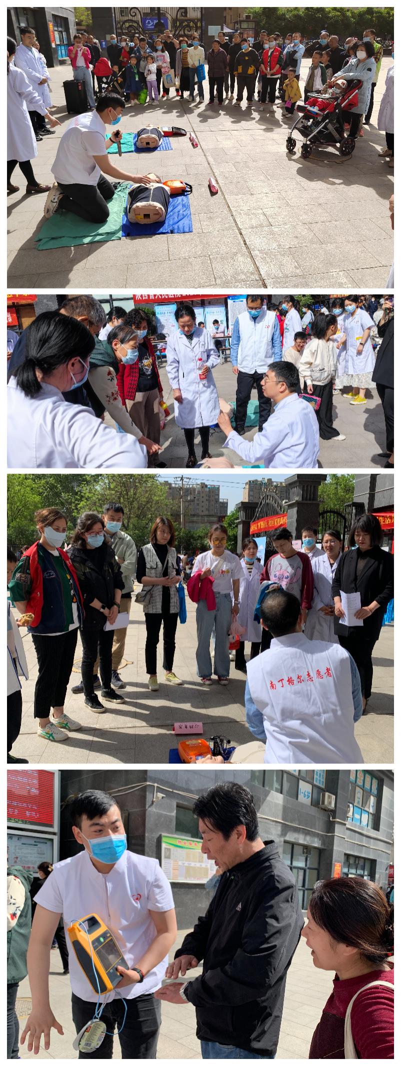 23名医护人员分为4组,为现场100多名社区群众进行了疾病咨询、血压血糖检测、心肺复苏和自动除颤仪(AED)培训、健康科普宣传等。普外专家张剑、肾内专家金刚、病理专家陈琳和刘洁、疼痛专家杨瑞、分娩镇痛专家朱婧进行健康咨询,答疑解惑。同时为现场群众测血糖、测血压、监测脉搏血氧饱和度,并提出针对性的治疗建议。赵义康、单冰、张世平等分别演示了心肺复苏、AED使用和海姆立克法急救等公益培训,作为活动现场人气最旺的环节,吸引了许多居民在模拟人上体验,此外为社区工作人员进行了第二轮的心肺复苏培训。现场还通过树立科普展架、张贴海报、发放卡片、宣传彩页等多种途径宣传健康知识。