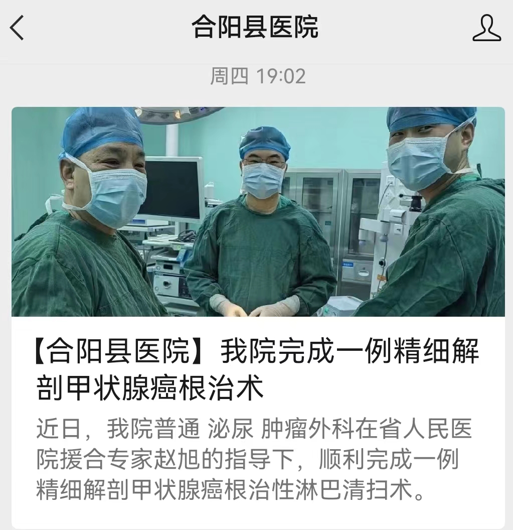 帮扶合阳县医院专家、普外一科赵旭主治医师凭借自身专业优势,充分分析评估病情,考虑甲状腺癌可能性大。从疾病危险性、治疗手段、治疗效果及预后等方面向患者及家属进行详细讲解,制定了缜密的治疗方案。适逢合阳县医院创建三级医院评审,病理科开展术中冰冻检查契机,赵旭医生指导县医院拟定好手术方案,指导开展了合阳县医院首例甲状腺癌根治术,手术过程顺利,术后恢复良好。