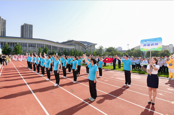 精彩的入场式结束后,全体人员面向国旗整齐站立,齐唱国歌。随后,院长宋张骏在开幕式上致辞并向全体运动员、裁判员及工作人员致以诚挚的问候。他表示,习近平总书记指出:“没有全民健康,就没有全面小康”,健康是促进人的全面发展的必然要求,也是广大人民群众的共同追求。一直以来,医院高度重视体育活动开展,始终把提高广大职工身体素质作为推动医院高质量发展的重要保障,作为人民健康的守护者,我们医务工作者首先要从自身做起,先让自己健康起来,才能更好地服务于人民群众。希望全院职工踔厉奋发、勇毅前行,始终保持身心健康、精神饱满、积极进取的状态,把“敢于挑战,勇于拼搏”的运动精神融入到今后的工作、学习和生活中,为省医院高质量发展做出新的更大贡献。紧接着,裁判员代表、运动员代表依次上台宣誓,工会副主席董梅宣读了比赛规则。