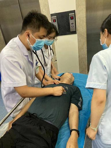 门诊二楼心内科诊区突听一句急促的呼喊。心内科医生赵永勇、分诊护士李娟琴、罗存珍闻声立即飞奔过去,经过判断意识、观察瞳孔、触摸颈动脉搏动等一系列操作,赵永勇医生立即给予患者开放气道,行胸外心脏按压,与此同时,李娟琴护士立即联系急诊抢救室和电梯,14:38分,急诊抢救小组到达抢救现场,急诊医生杜君华,护士宋欢、刘凡祯急诊轮流对患者行胸外按压,大家齐心协力合力施救,共同将患者转移到抢救床,立即转送至急诊抢救室进行后续治疗,目前患者已被转至心血管内一科进一步治疗。