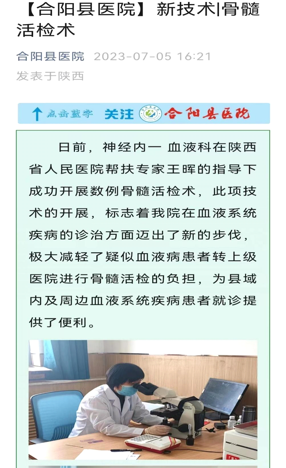 派驻合阳县人民医院帮扶专家--血液内科王晖副主任医师,指导合阳县医院神经内一血液科成功开展数例骨髓活检术,完善了县医院血液系统疾患诊治体系,同时标志着县医院血液系统疾病诊治迈上了新的台阶。此项技术的开展,填补了合阳县域该项技术空白,为合阳县域内及周边血液系统疾病患者就诊提供了极大便利,为患者带去了福音。