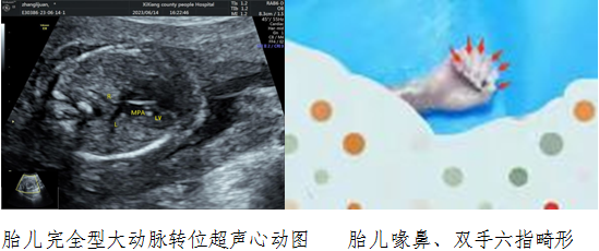 病例四,30岁,孕19+W,G2P1,产前唐筛检查结果低风险,来院行产前超声检查。贾玄慧医生通过检查,超声诊断:胎儿先天性心脏病、完全型大动脉转位、室间隔缺损;颅面部声像图所见考虑全前脑、喙鼻;双肾声像图所见考虑多囊肾。告知孕妇胎儿存在多发畸形,且预后差。孕妇于多家复查结果一致,终止妊娠,产后见胎儿并存双手六指畸形等。