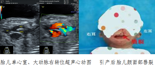 病例二,32岁,孕22w+,G3P1,在西乡县人民医院常规产检。贾玄慧医生行超声检查发现胎儿存在多发异常,心脏为致死性畸形。超声诊断:胎儿先天性心脏病,单心房、单组房室瓣并大量反流,单心室(大动脉右转位),先天性唇裂,右侧小耳,胃泡未显示。贾大夫告知孕妇妊娠风险及建议,后经多家医院产前遗传学检查会诊,明确诊断行引产手术。