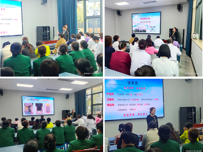 医疗废物管理是医院安全工作的重要环节。随着西咸院区医疗业务的不断扩展,为进一步规范临床医护技人员对医疗废物的管理,在米涛副院长、段降龙副院长指导下,后勤服务中心李杞峡处长和业务管理部刘鹏副处长组织,11月10日上午,西咸院区举办医废管理培训,西咸院区临床医技科室医护和保洁人员参加,王倩总护士长主持。