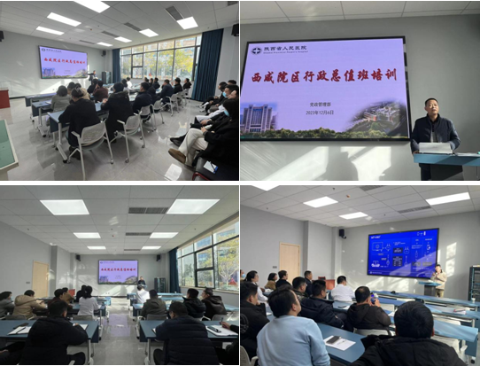 为进一步规范和加强西咸院区行政总值班,确保班后及节假日安全稳定运行,党政管理部组织开展行政总值班培训,三个管理部、发展建设部、药学部、信息处、医学装备部、耗材试剂部、省临检中心等9个部门39名成员参加,党政管理部负责人赵小路主持。