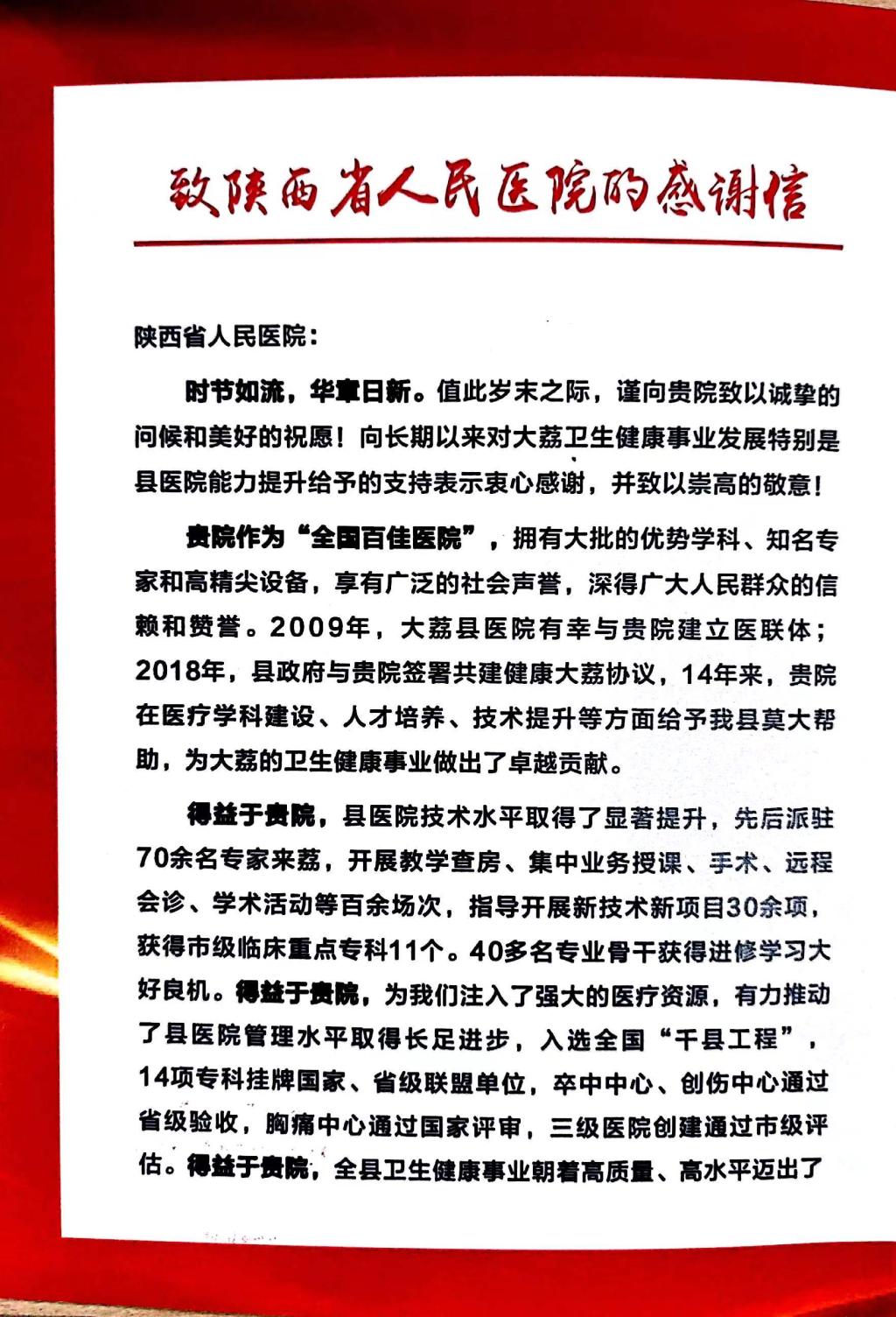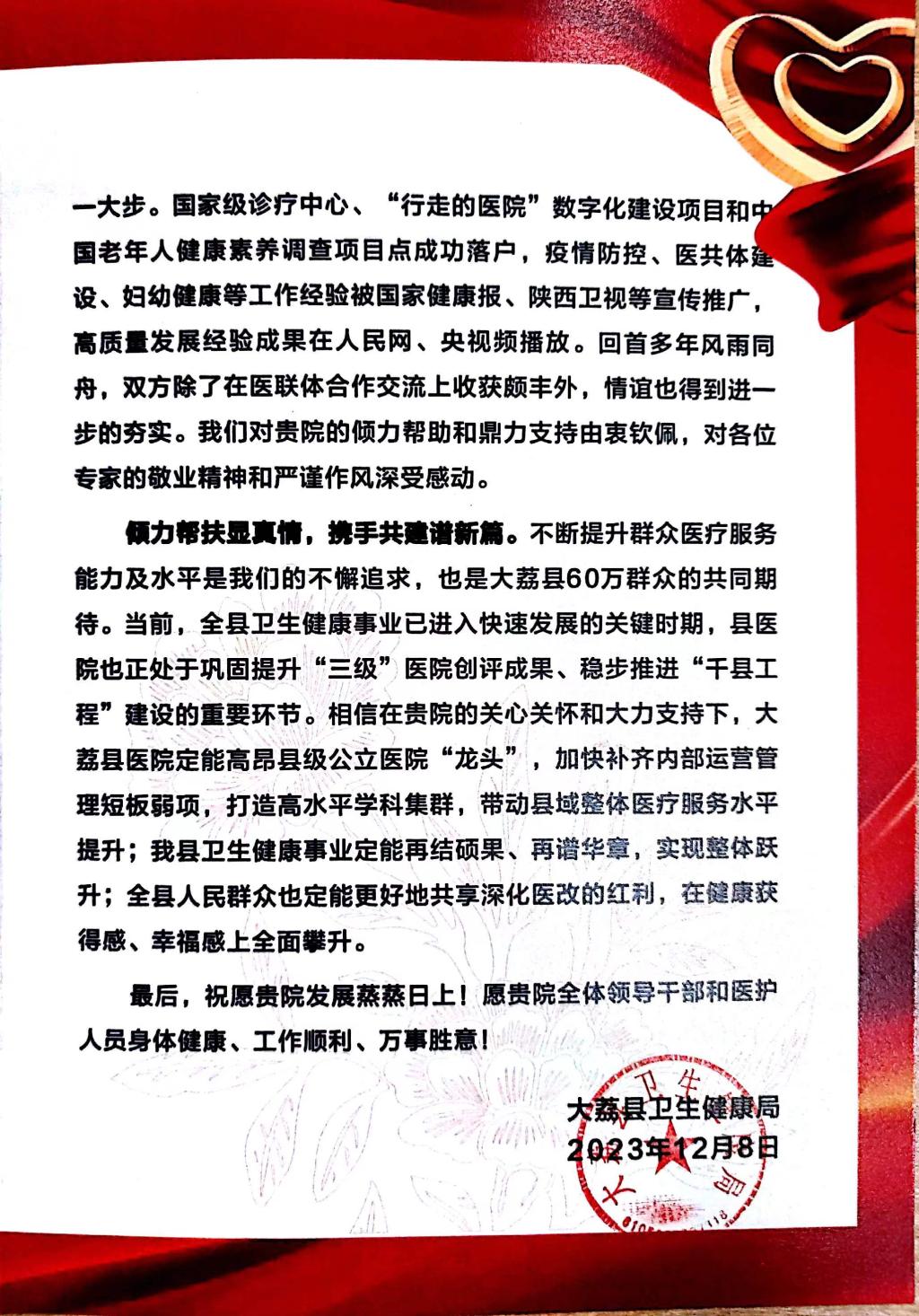 12月8日,大荔县卫健局向欧美视频 发来感谢信,对欧美视频 长期以来对大荔卫生健康事业发展特别是县医院能力提升给予的支持表示衷心感谢,感谢信全文如下: