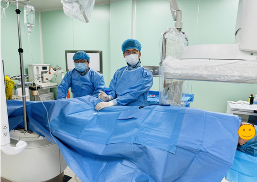 “组团式”帮扶队员—心内科邓纪钊,立即组织指导多学科团队开通胸痛绿色通道,有条不紊进行急诊术前相关检查,诊断为急性下壁心肌梗死。绕行病房,直达介入手术室,仅用32分钟顺利开通血管,患者转危为安,预后良好。