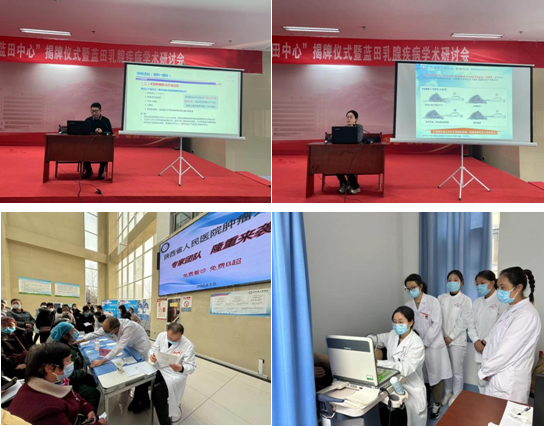 科研处彭宁处长致辞。肿瘤病院李建辉常务副院长、肿瘤外科祝旭龙副主任、张颖护士长、曹伟副主任医师及科室学科骨干2人参加揭牌仪式,与蓝田县人民医院各临床科室主任、护士长以及来自各乡镇卫生院的业务骨干进行学术交流,并进行乳腺、甲状腺相关疾病的义诊。