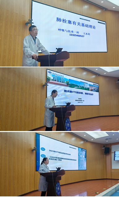VTE防治质控指标整体情况进行了汇总分析,并对医院《2024年提高静脉血栓栓塞症规范预防率实施方案》进行了解读。呼吸与危重症一科王贵佐副主任医师围绕VTE的临床特点、诊断、预防和治疗全方位地讲解了静脉血栓栓塞症的相关知识。呼吸与危重症一科王水利主任医师结合多个典型临床病例对围手术期肺栓塞影像学特点进行了详尽讲解。培训后参培人员进行现场考核,同时医务处将培训内容录制为视频课程供大家继续学习,确保培训取得实效。后续医务处还将组织系列围手术期安全管理专项培训。