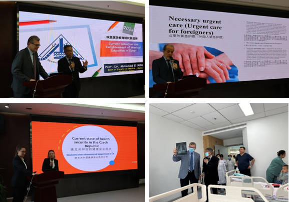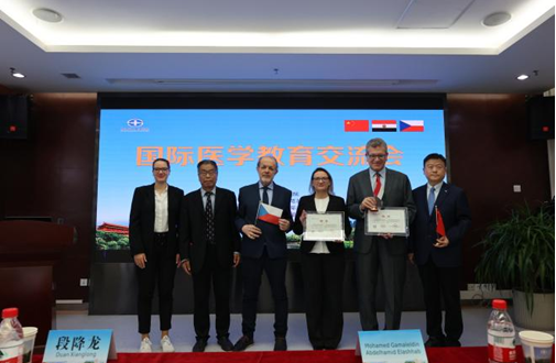 国家引智引才示范基地特聘外国专家”聘书。本次会议以“医学教育”为主题,埃及本哈大学医学院院长Mohamed Gamaleldin Abdelhamid Elashhab教授以《埃及医学教育现状及启示》、捷克欧洲中医药中心主席Jan Hovorka教授以《捷克急危重症救治体系》、捷克欧洲中医药中心主席助理Marketa Zelinkova教授以《捷克医疗安全现状》为内容授课,分享了埃及、捷克两国医学教育体系及培养模式、医疗安全体系,受到与会师生的好评。
