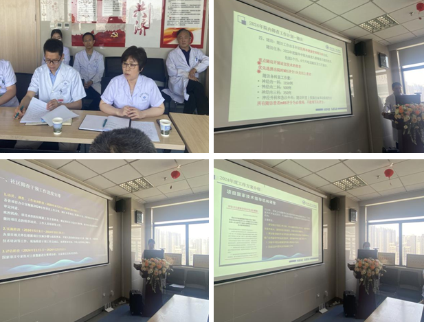 会上,神经内一科柳汶其医师传达了国家2024年脑卒中筛查与干预项目启动会会议精神。院内筛查牵头科室神经内一科胡军副主任、院外筛查牵头科室神经内二科陈瑞利医师分别汇报了2023年度项目院内外筛查与干预完成情况及存在问题,对2024年工作进行了安排。