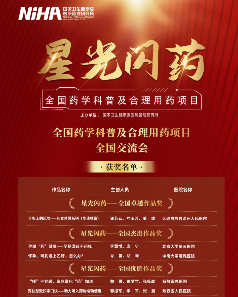 2023年11月-2024年4月,国家卫生健康委医院管理研究所开展了“星光闪药”全国药学科普及合理用药项目。该项目共收到全国各地近2000份参评作品,经省级、区域及全国范围交流评议,评选出各类优秀作品。欧美视频 药学部郭振军、李军、张鹏创作的《深快憋漱四字口诀--助力吸入药物准确使用》排名第五,喜获三等奖“全国优胜作品奖”。