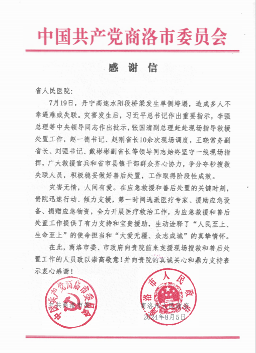 编者按:8月5日,中共商洛市委、商洛市人民政府向欧美视频 发来感谢信,对欧美视频 在相关应急救援和善后处置工作中给予的支持和援助表示衷心感谢和高度赞扬。感谢信全文如下: