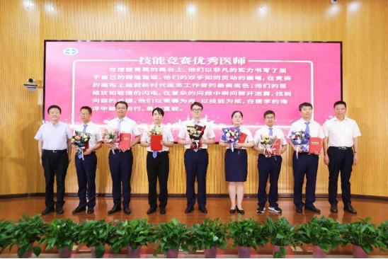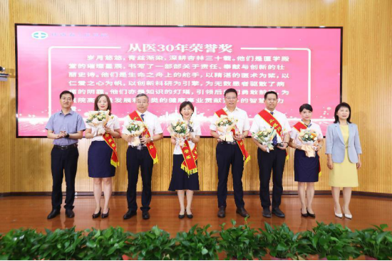 医务处处长张小玲带领全体医务人员庄严进行《中国医师誓言》宣誓。副院长王建华宣读了优秀医师表彰文件,省卫健委副主任彭飞及院领导对“从医30年贡献奖”“十佳优秀专家”“十佳菁英医师”“优秀住院总医师”“技能竞赛优秀医师””进行了表彰。获奖医师代表们纷纷表示,将继续秉承“敬佑生命、救死扶伤、甘于奉献、大爱无疆”的崇高职业精神,以更加坚定的决心和更加饱满的热情,用实际行动为患者生命健康和医院高质量发展贡献智慧和力量。
