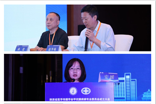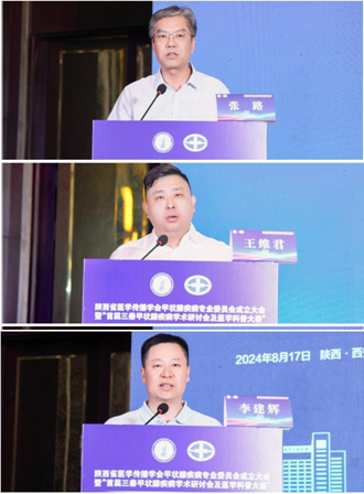 党委副书记张路代表医院致辞,表示期待与陕西省医学传播学会一道,推动全省范围内的医疗发展和学术交流,希望专委会在多学科合作、政策建议和公众健康教育等方面取得更大进展,最终提高甲状腺疾病的规范诊治和公众健康素养。陕西省医学传播学会王维君常务副会长代表协会进行了发言,对专委会的成立表示祝贺,期望专委会的成立能够带动我省对该疾病的诊疗水平,提高民众对甲状腺疾病的关注度。李建辉主任表示,专委会将针对甲状腺疾病尤其是甲状腺癌的规范诊治开展科普宣教,紧密围绕学术、科普、科研、教学等工作,立足优势,培养优秀人才,推动甲状腺专业学科建设,提升甲状腺疾病的诊疗水平。