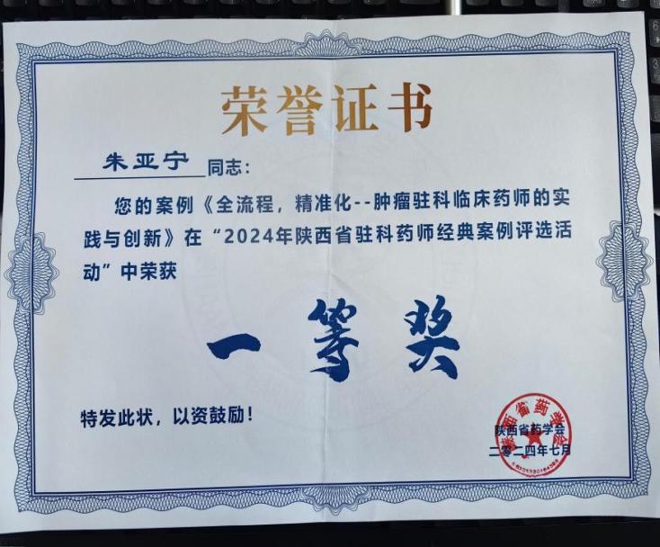 比赛案例率先在全国29个省份进行初选,每省推送前两名案例代表本省参与区域竞技。在7月份举行的陕西省赛区评选中,朱亚宁副主任药师的案例《全流程·精准化:肿瘤驻科临床药师的实践探索与创新》凭借其独特的视角、深入的分析以及实践成效,从全省12个案例中脱颖而出,荣获陕西赛区第一名。9月4日,朱亚宁副主任药师携此案例再战西北五省大赛,斩获第一名,并成功晋级至全国总决赛,10月份将代表我省及西北赛区展示欧美视频