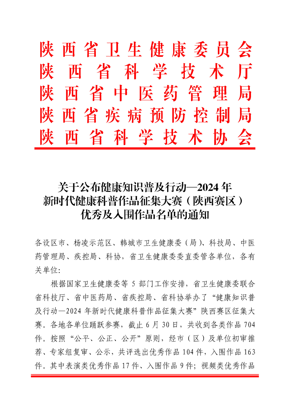 近日,陕西省卫生健康委员会、陕西省科学技术厅、陕西省中医药管理局、陕西省疾病预防控制局、陕西省科学技术协会联合发布《关于公布健康知识普及行动——2024年新时代健康科普作品征集大赛(陕西赛区)优秀及入围作品名单的通知》,欧美视频