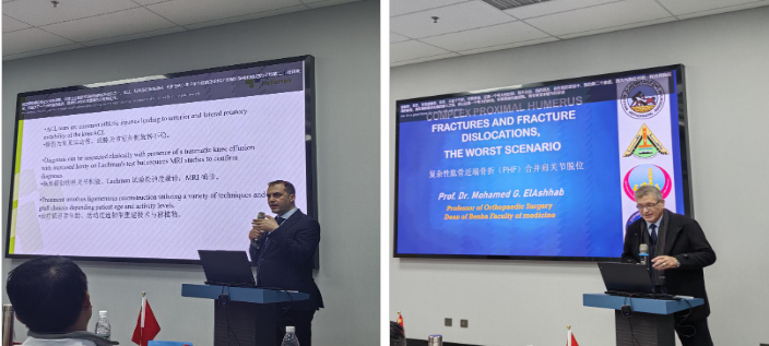 骨科医护人员和在院规培人员做了《复杂性复杂性肱骨近端骨折(PHF)合并肩关节脱位》《前交叉韧带损伤》的专题讲座。段降龙副院长代表医院国家引才引智示范基地对到访专家表示热烈欢迎,并为AHMED教授颁发聘书。MOHAMED教授为儿童病院焦富勇名誉院长颁发埃及本哈大学客座教授聘书。随后,两位教授在段降龙副院长、刘时璋主任的陪同下参观欧美视频