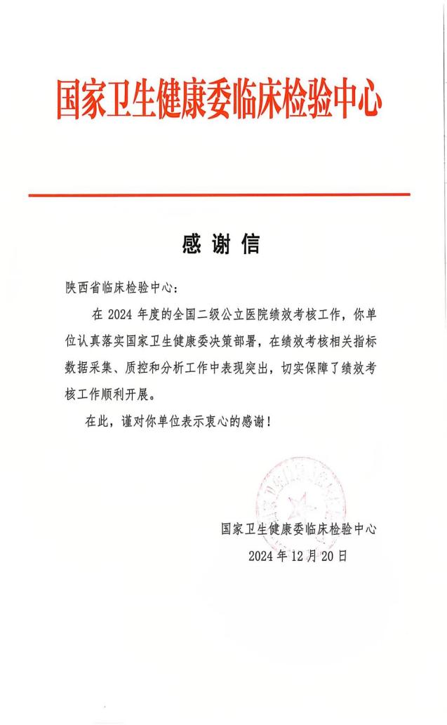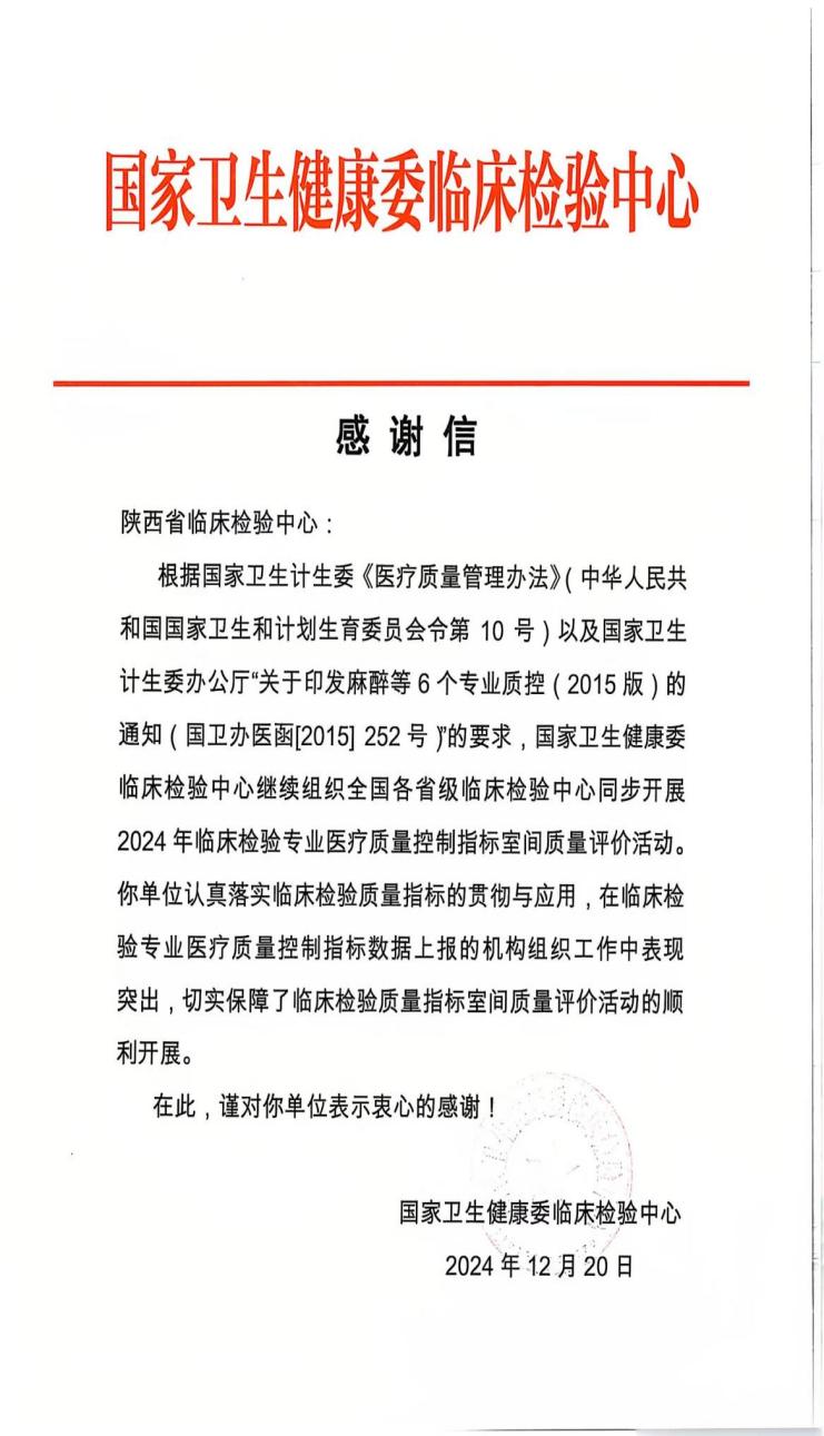 12月20日,欧美视频 省临床检验中心收到国家卫生健康委临床检验中心发来的两封感谢信。信中对欧美视频 省临床检验中心在临床检验专业医疗质量控制指标数据上报的机构组织工作以及全国二级公立医院绩效考核相关指标数据采集、质控和分析工作中的突出表现表示感谢。