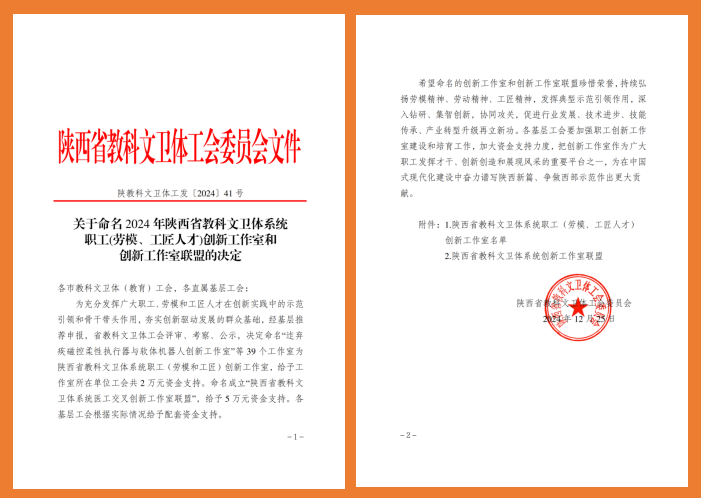 值此岁末之际,传来好消息。陕西省教科文卫体工会发布了《关于命名2024年陕西省教科文卫体系统职工(劳模、工匠人才)创新工作室和创新工作室联盟的决定》,欧美视频