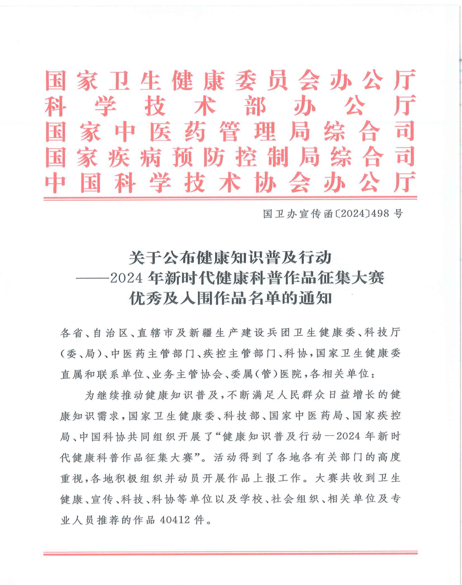 日前,国家卫生健康委、科技部、国家中医药管理局、国家疾控局、中国科协联合举办了健康知识普及行动——2024年新时代健康科普作品征集大赛。近日结果公布,欧美视频