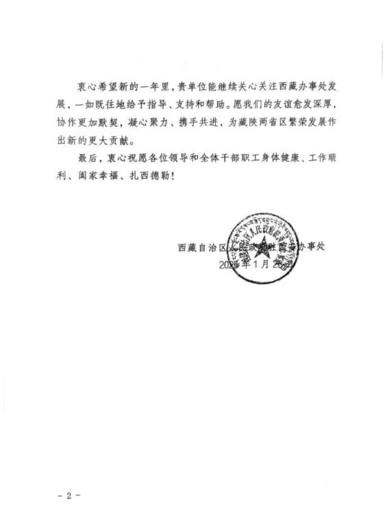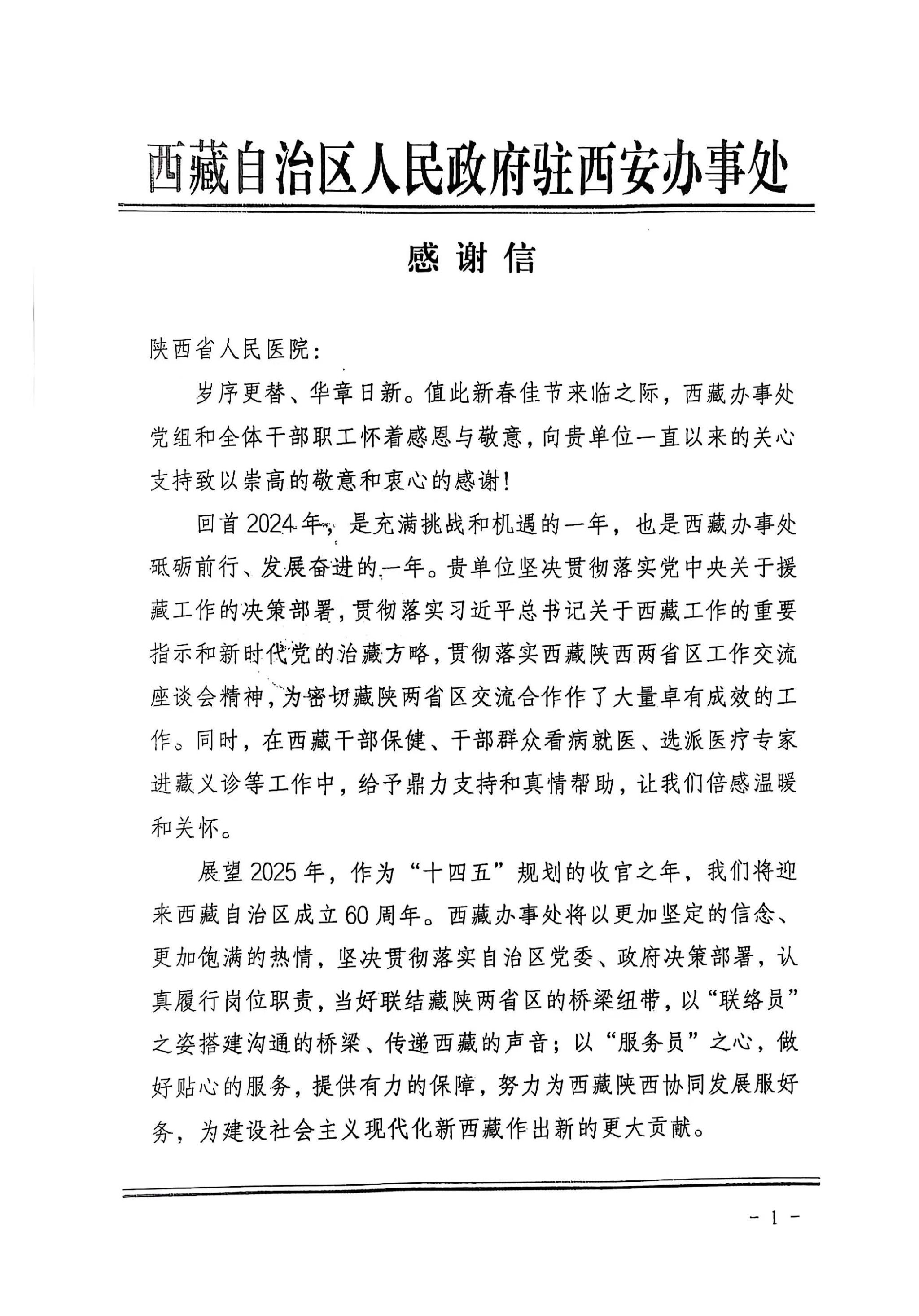 编者按:1月27日,西藏自治区人民政府驻西安办事处向欧美视频 发来感谢信,对欧美视频 长期以来在西藏干部群众看病就医、医疗专家援藏义诊等工作表示衷心感谢。