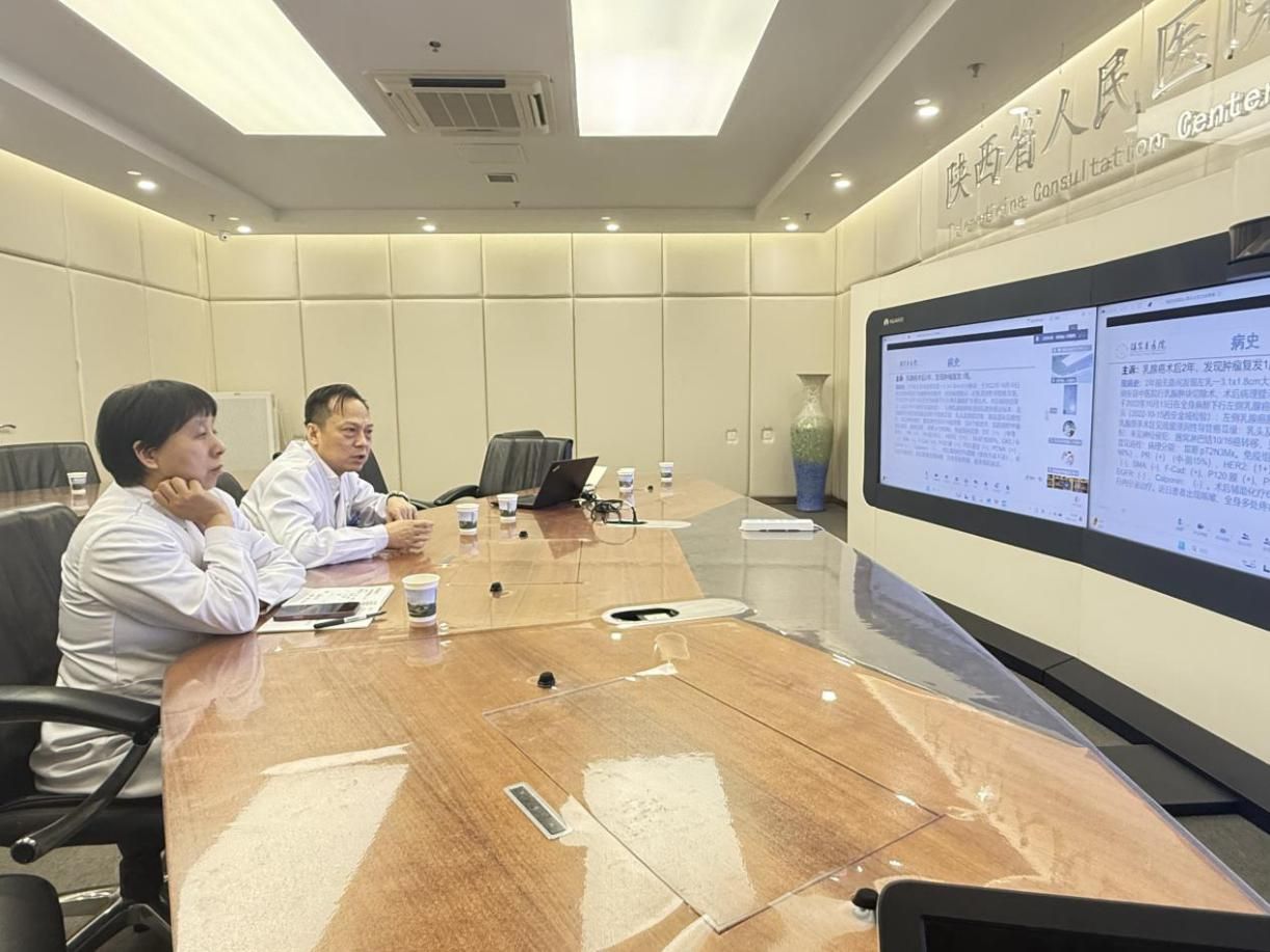 胃部肿瘤MDT团队负责人主持开展了第一例胃部肿瘤患者远程多学科会诊。其余4例由基层医疗服务部组织泌尿外科、胸外科、肿瘤外科、心脏外科、肿瘤内科、营养科、影像诊断中心、药学部、感染性疾病科等专业,30余名专家构成“云端多学科团队”,与镇安县医院医务人员同步上线,通过实时调阅患者相关病历及检查影像资料,专家们从不同角度对相关病例进行了全面分析,为5位患者制定了个性化诊疗方案,并就检验检查、营养方案调整、用药指导、康复训练及随访计划等给予精准指导。镇安县医院参与讨论的医务人员对欧美视频