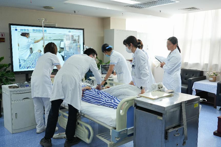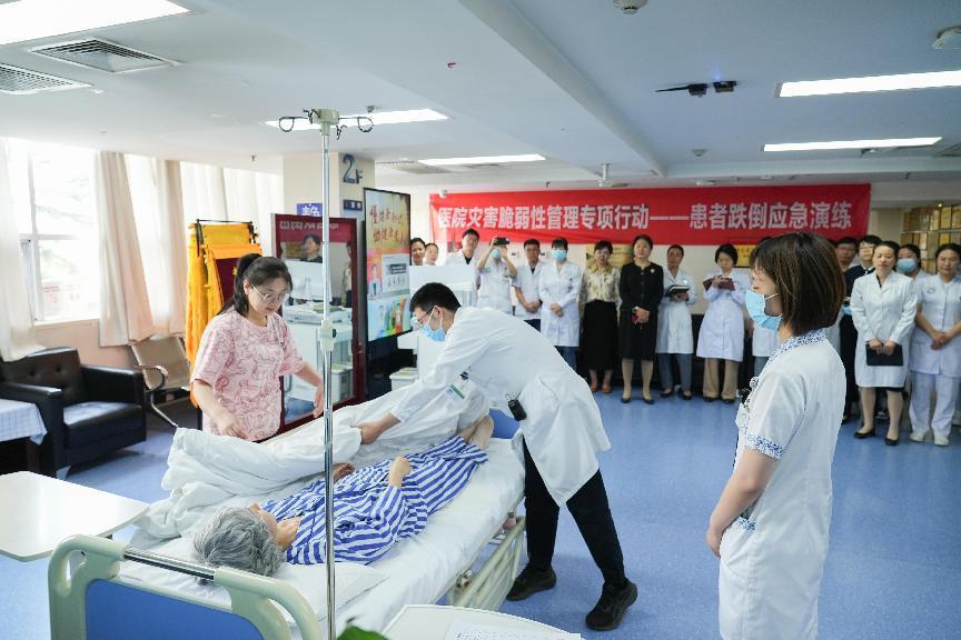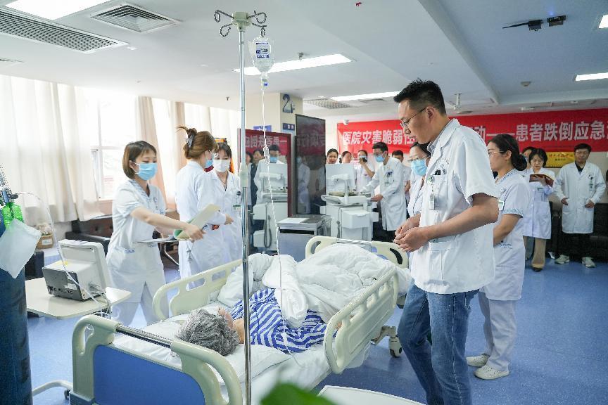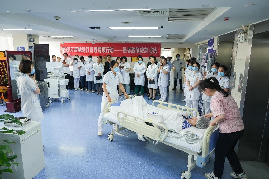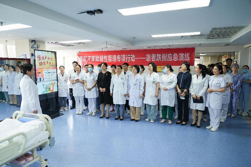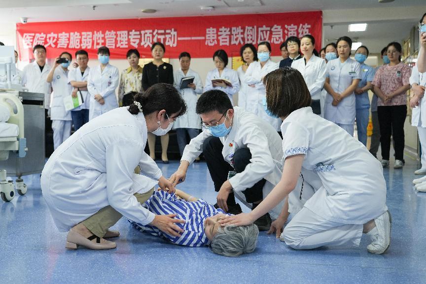 第三的灾害风险,4月23日下午,医院组织开展“预防跌倒伤害,护航患者安全”院级应急演练。演练严格按照场景模拟、应急处置、专家点评三个环节有序实施,创新构建医、护、患、陪护及保洁人员“五位一体”协同防护体系。院办、复审办、护理部、医务处、神经内三科、耗材试剂部、后勤服务中心、骨科、神经外科等相关职能部门和科室相关人员参加演练。演练由护理部副主任刘红梅主持。