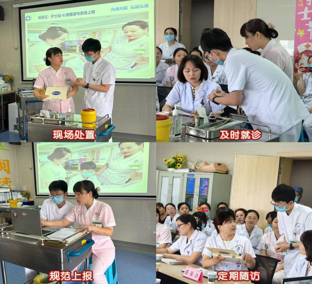 演练模拟了临床工作中常见的职业暴露场景,由妇科医护人员、皮肤科杨思璇医师、院感办晁娜主管护师配合完成。流程分为三个部分:一是以练为战、模拟真实场景。以常见的“锐器伤”为背景,模拟一名护士在为患者采血时发生梅毒针刺伤的场景,全程分为现场处置、及时就诊、规范上报、报告随访四个环节。二是以练促防、共筑安全屏障。医生展示了传染病手术正确着装规范、感染性医废处置方法、三种类型手套的使用场景。三是常用利器的使用及处置。工作人员现场讲解示范了利器盒的正确使用方法、单手针头回帽、蝶形针的使用及防刺伤演示等。随后皮肤科杨思璇医师为大家讲解了梅毒的相关知识及暴露后的预防用药。演练过程中,医护人员反应迅速、操作规范,多部门联动高效有序,展现了欧美视频