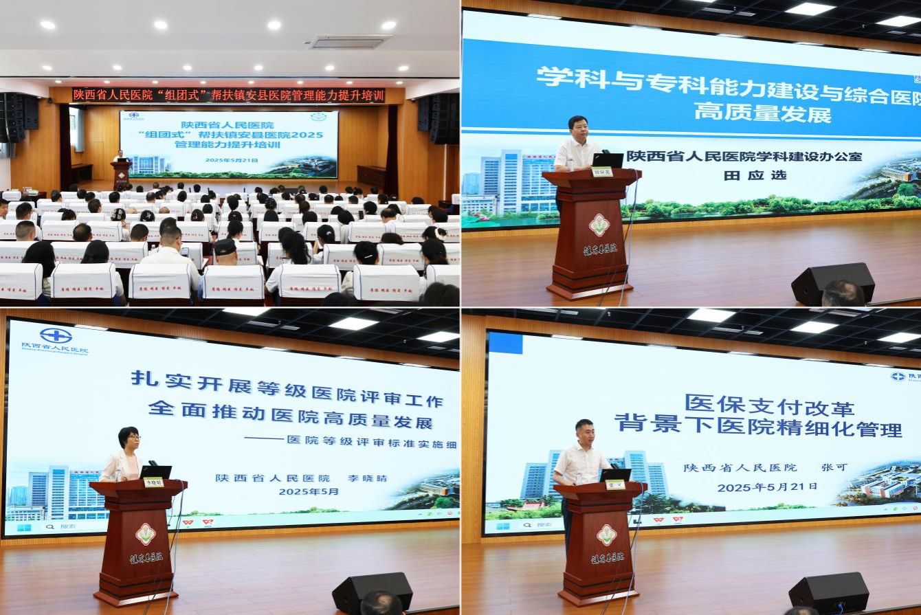 专家团队还为镇安县医院干部职工开展了专题培训。学科办主任田应选、等级评审办公室主任李晓晴、医保处干事张可分别以《学科与专科能力建设与综合医院高质量发展》《扎实开展等级医院评审工作全面推动医院高质量发展》《医保支付改革背景下医院精细化管理》为题,系统分享管理经验与改革案例,为县医院高质量发展注入新思路。
