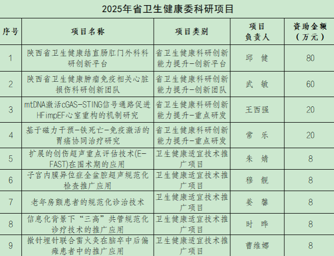 此次获批项目涵盖科研创新平台建设、创新团队培育和重点研发计划等多个方向。其中,卫生健康科研创新能力计划项目旨在完善我省医学科技创新体系,提升卫生健康领域自主创新能力;适宜技术推广项目则重点推动基层医疗机构常见病、多发病的规范化诊疗,促进优质医疗资源下沉,让更多群众受益。