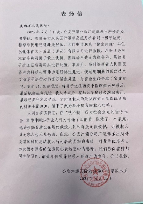 6月25日,公安浐灞国际港分局广运潭派出所民警将一面承载着谢意的锦旗和表扬信送到霍帅帅手中,信中盛赞霍帅帅在危急关头挺身而出,“救人于危难之中,助人于急需之时”,传递了强大的社会正能量。