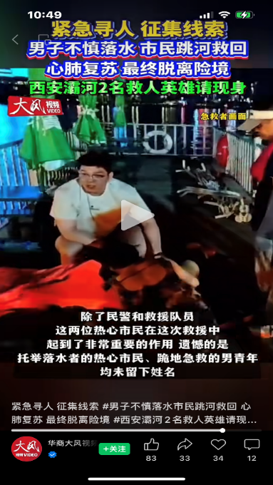 6月3日晚,西安市浐灞生态区揽月桥畔,一名男子在湍急的灞河中挣扎沉浮,生命危在旦夕。