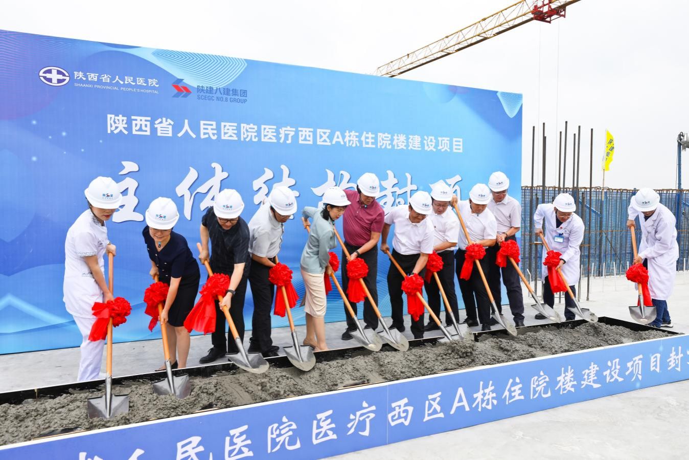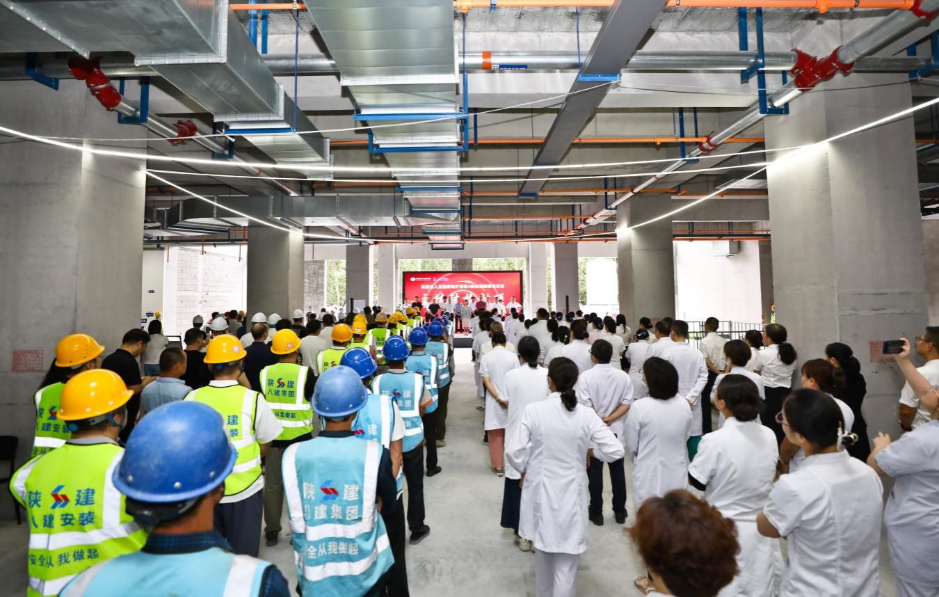 举行医疗西区A栋住院楼建设项目封顶仪式。党委书记张玉莲、院长宋张骏及在院领导班子成员,陕建八建集团党委书记、董事长章辉,中建西北院、正大鹏安建设项目管理有限公司等相关参建单位领导,各职能部门、临床医技科室职工代表以及项目建设者共同参加仪式。仪式由副院长米涛主持。