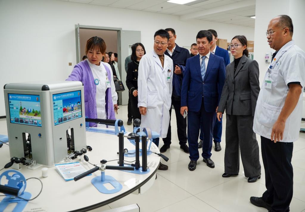 任柯对萨里耶夫主席一行到访表示热烈欢迎,并带领来宾实地参观了门诊大厅、影像中心、急诊医学中心、康复医学科、检验科以及院史馆等区域,详细介绍了西咸院区功能布局、诊疗特色、设备配置及医院历史文化等。