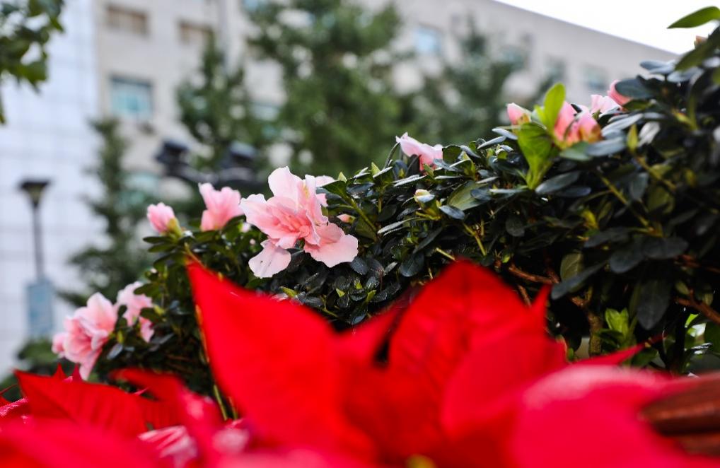 据悉,本次节日布置选用12个品种共4000余株花卉,以一品红、杜鹃花、凤仙花、栀子花等时令花卉为主,以红黄暖色调营造热烈氛围。花卉主要分布在医院北门内外、喷泉广场、门诊楼西侧和住院大楼前等人流密集区域,与跳跃的喷泉、悠扬的乐曲相互映衬,构成一幅和谐生动的院区画卷。