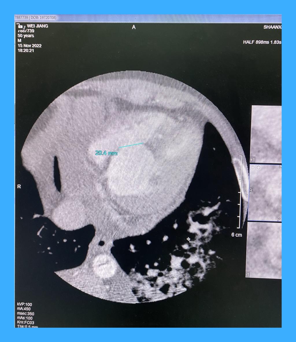 心脏外科,付建莉主任医师心脏超声检查,确诊为心脏左室下壁瘤样膨出,与正常室壁呈矛盾运动,测其瘤口为41mm,瘤深27mm,后室间隔下壁回声失落,左室面缺损口大小38mm,右室面缺损口大小21mm,病情十分危急。