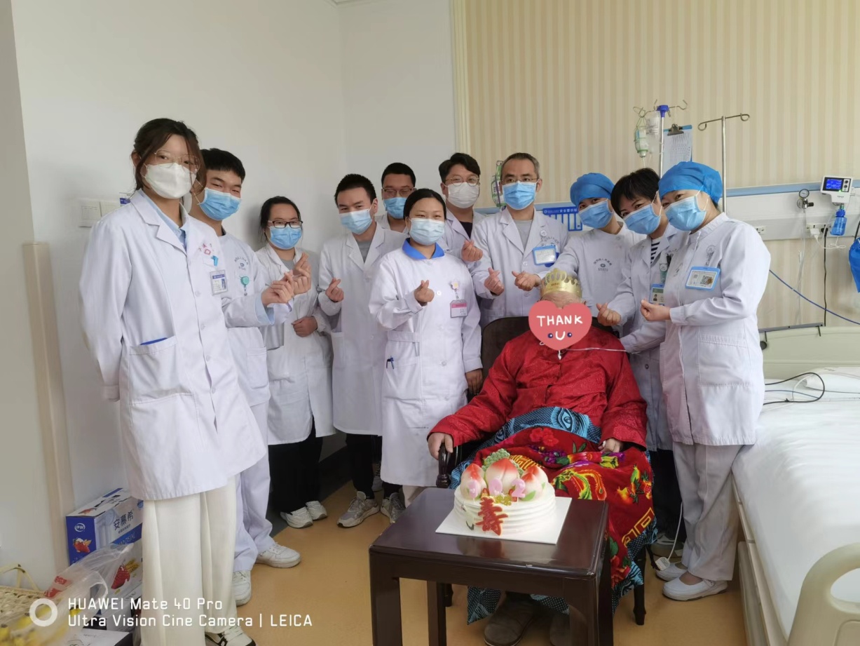 患者患有冠心病、慢性阻塞性肺病、多发脑梗死等多种慢性病,长期于西院一病区就诊,在科室赵媛主任、王甜副主任医师、何小静护士长及全体医护人员的精心救治下,多次转危为安。2021年因“急性化脓性胆管炎、感染性休克”入住西院一病区,科室及时组织多学科会诊,联合肝胆外科、介入手术室给予“床旁胆囊穿刺引流”,以及抗感染等综合治疗后,成功转危为安。2022年再次因“新冠肺炎,2型呼吸衰竭,慢性心力衰竭急性加重”入院,科室克服困难,再次创造了生命奇迹。