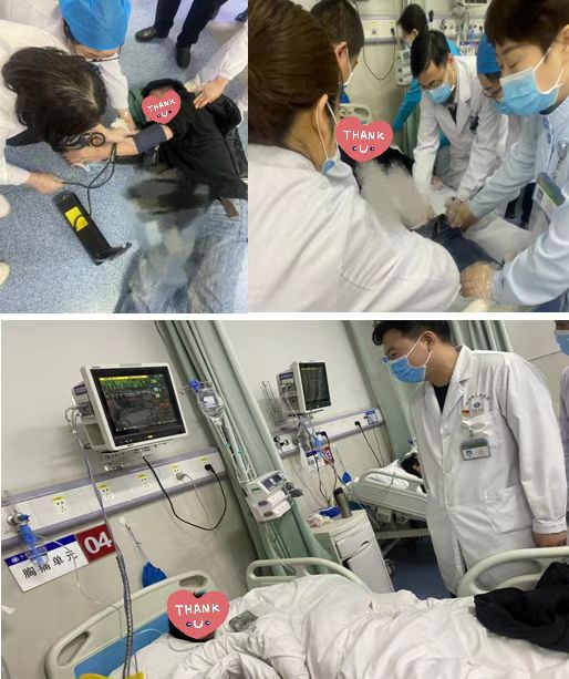 党倩丽主任医师立即查看患者病情,并调派人员配合救治。平躺的患者面部苍白越发明显,四肢湿冷、胸闷憋喘、意识模糊,王希艳护师、张娜护师分别记录患者脉搏、血压,结合患者症状、体征,党倩丽主任医师判断患者为“急性荨麻疹,出现过敏性休克状态”,迅速启动相关抢救应急预案。田军医师与急诊科联系并详述患者病情。在确保安全情况下,殷董医师和尚亚洲技师将患者送往急诊抢救室进行救治,数分钟完成了生命的平安转运。