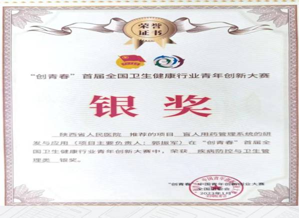 会上,为“创青春”首届全国卫生健康行业青年创新大赛获奖项目颁发证书,欧美视频 药学部郭振军主任助理作为主要负责人的项目《盲人用药管理系统的研发与应用》荣获“疾病防控与卫生管理类”银奖。