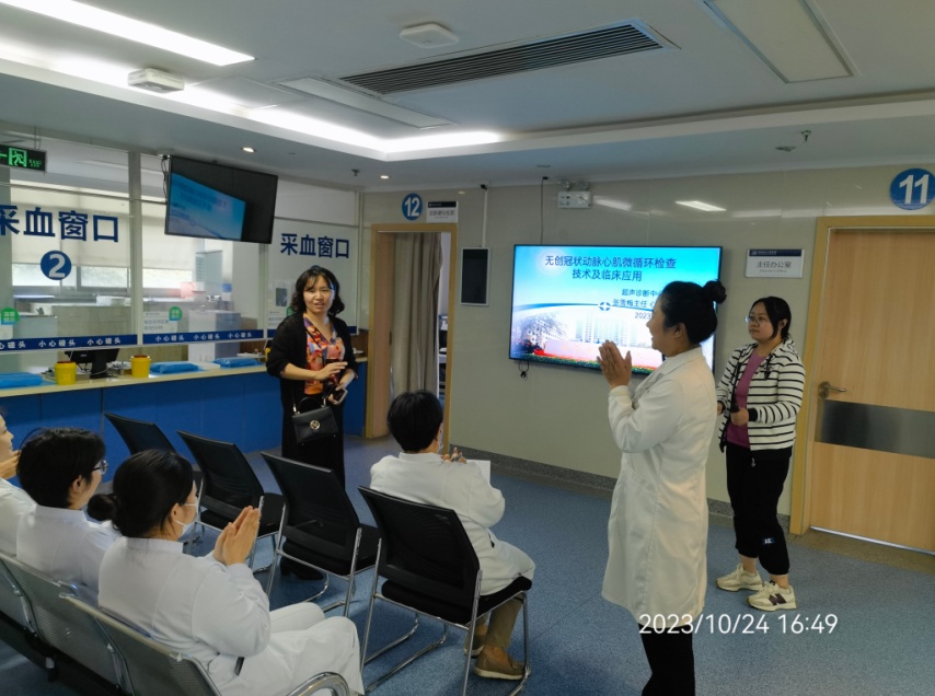 为进一步加强科室间交流协作,推动超声新业务、新技术更好地服务于临床及患者,10月24日下午,超声诊断中心张雪梅副主任带领心脏造影团队前往门诊体检中心,开展了题为《无创冠脉心肌微循环检查技术及临床应用》的业务学习交流活动,这是超声诊断中心心脏造影亚组第九次走进临床科室。