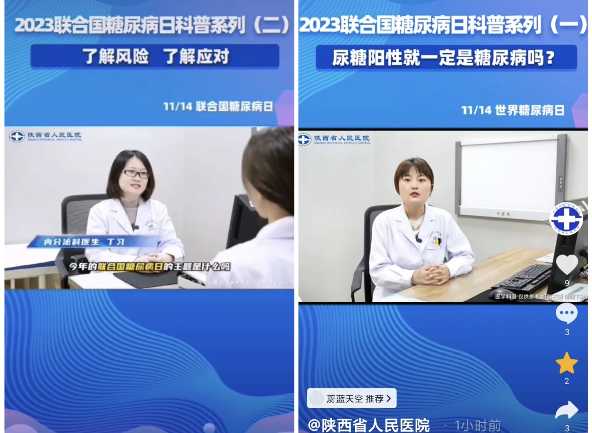 ”官方抖音号、视频号及“陕医内分泌糖尿病”微信公众号围绕糖尿病主题推送科普视频及文章,帮助广大群众了解糖尿病的危害及风险,预防糖尿病,管理糖尿病。