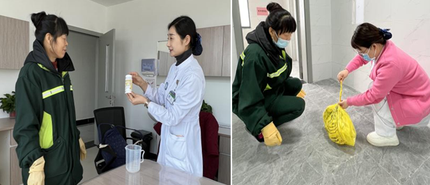 培训从保洁员的仪容仪表、行为规范作了详细的讲解,提出保洁员上班期间必须着工作服并按照保洁公司及标准的工作流程完成各项工作,作为特殊科室更要严把院感防控底线,从细节抓起,杜绝科室发生院感事件可能。张丹副护士长分析了科室三区两通道的特点及保洁工作中存在的问题,对保洁日常工作与医院感染管理的关系、医疗废物的分类管理、工作中的个人防护、锐器刺伤后的紧急处理、手卫生等几方面进行了详细的讲解。感控护士姚丹对消毒液的配置、医疗垃圾袋的鹅颈式封扎、各区域消毒以及病房的终末消毒等作了全面的培训。