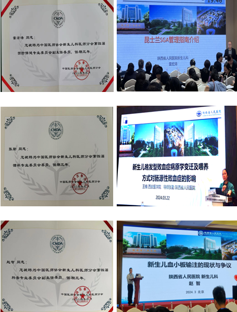 新生儿科张勤名誉主任当选中国医师协会新生儿医师分会第四届循环专业委员会委员;雷宏涛主任当选预防保健专业委员会副主任委员;赵智副主任当选科普专业委员会副主任委员。同时参会的三位专家分别在各自所属专业领域的分会场做了关于“新生儿晚发型败血症病原菌变迁及喂养方式对肠源性败血症的影响”、“昆士兰SGA管理指南介绍”和“血小板输注的现状与争议”的大会发言。