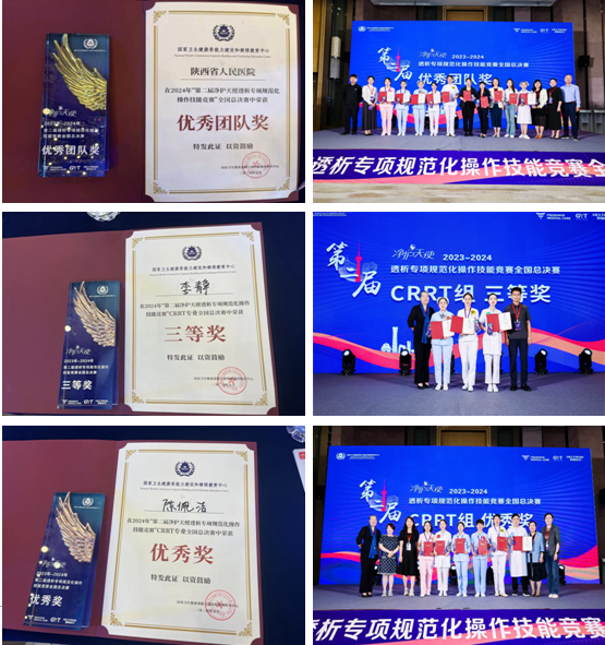 肾病血透中心护士李静和陈佩洁分别获得CRRT组三等奖和优秀奖的荣誉,同时医院也获“优秀团队奖”。