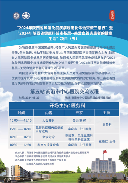 风湿免疫科启动“2024年陕西省风湿免疫疾病规范化诊治交流三秦行”暨“2024年陕西省健康科普走基层——关爱血管炎患者的健康生活”项目,5月30日走进了商洛市中心医院。