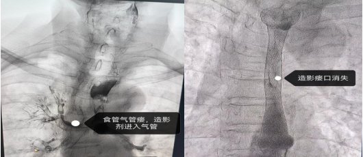 患者为男性,以“食管癌27月,化疗6周期后出现吞咽困难”入院,患者进食困难进行性加重,出现饮水后呛咳、肺部感染及食管气管漏。吴昱主任充分评估了患者病情,为使以最小代价改善患者生活质量,充分讨论后,决定为患者实施DSA引导下食管气管瘘支架封堵术。经患者及家属同意,手术由吴昱副主任医师主导,县医院胸外肿瘤科医师团队配合完成,手术过程顺利,术后患者饮食无呛咳症状,造影复查显示水及食物均经食管顺利通过,未见外溢漏出,恢复良好,手术效果明显。