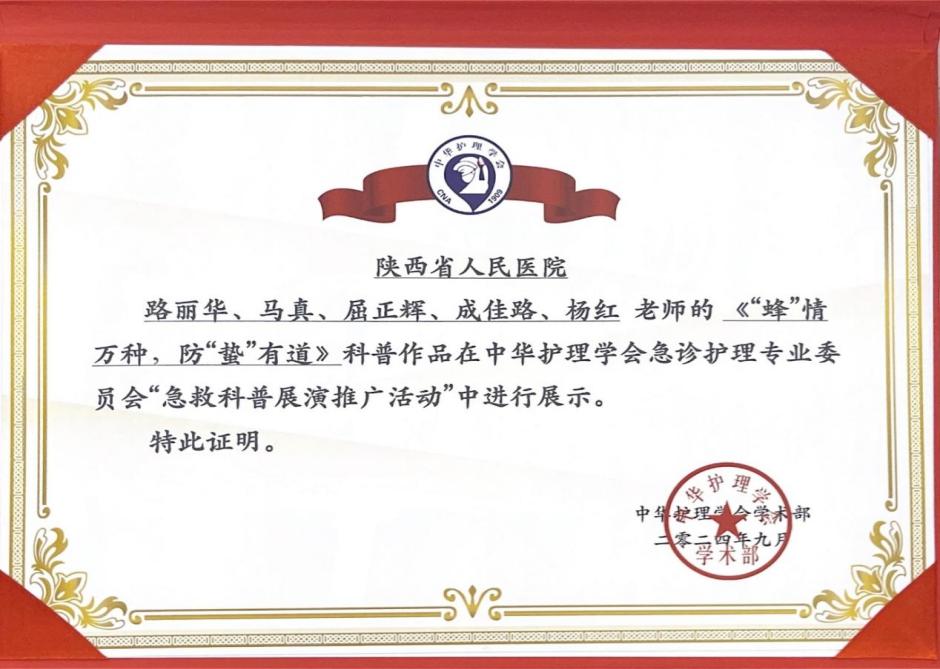 以《“蜂”情万种,防蛰有道》为题,在陕西省护理学会举办的遴选活动中荣获第一名,被推荐代表陕西省参加全国急救科普展演推广活动。